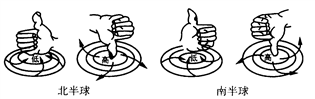 北半球的气旋、反气旋:右手半握,大拇指向上,表示气旋中心气流上升,其他四指表示四周气流方向是逆时针,东部吹偏南风,西部吹偏北风。大拇指向下,表示反气旋中心气流下沉,其他四指表示四周气流呈顺时针方向流动,东部吹偏北风,西部吹偏南风。