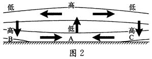 空气的上升或下沉,导致了同一水平面上的气压差异(如图1)。气压差异又形成大气的水平运动(如图2)。