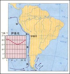 秘鲁寒流是世界上行程较长的寒流之一,从45°S开始,沿南美大陆西岸北流,一直到达赤道附近,流程达4600多千米,水温比邻近海区低7~10℃。受秘鲁寒流的影响,南美西岸分布着世界上南北延伸最长、最靠近赤道的热带荒漠,气候干旱、温度较低。