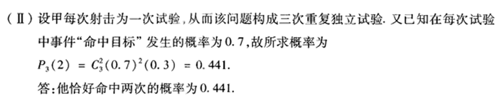(2) 若甲单独向目标射击三次,求他恰好命中两次的概率。