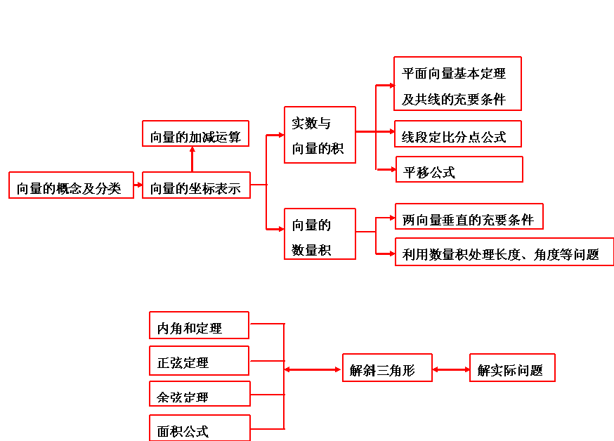 3、由于向量有几何法和坐标法两种表示,它的运算也因为这两种不同的表示而有两种方式,因此向量问题的解决,理论上讲总可有两个途径,即基于几何表示的几何法和基于坐标表示的代数法,在具体做题时要善于从不同的角度考虑问题.