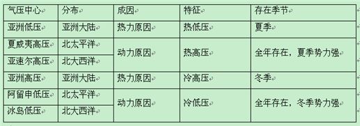 〖应用〗海陆热力性质差异 ①海陆的热力性质差异,风带和气压带发生的变化: 陆地和海洋的热力性质不同,同样容积的陆地和海洋相比,同时升高1度,海洋需要的热量比陆地多。因此,夏季同纬度陆地与海洋相比,陆地温度高,气压低;海洋温度低,气压高;冬季相反。 ②北半球的冬、夏两季气压中心: