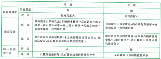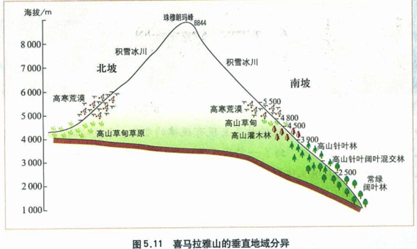 1、珠穆朗玛峰地区南、北坡的垂直自然带: