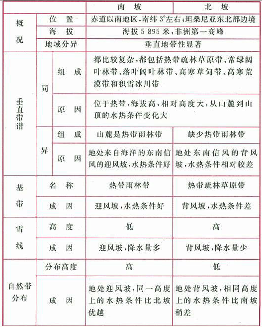 2、乞力马扎罗山南、北坡的垂直自然带:
