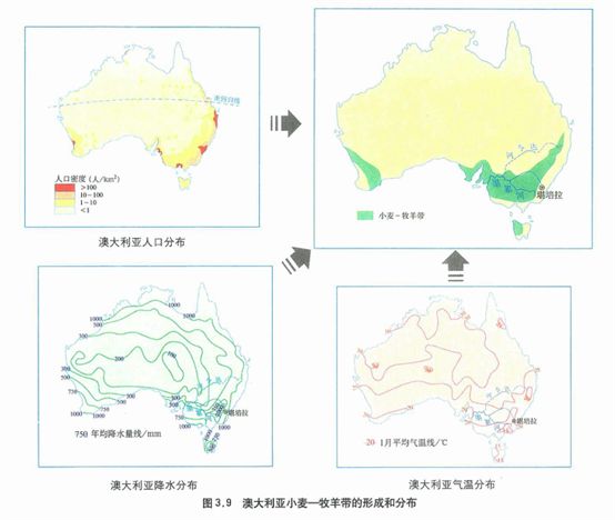 早在18世纪,英国向澳大利亚流放犯人,开发牧场,引进良种美利奴羊。19世纪上半叶澳大利亚实行了“牧者有其地”的鼓励政策。在澳大利亚东南部气候暖湿、土壤肥沃的地区,农民曾与牧民争夺土地。19世纪中叶,人们发现金矿,牧民纷纷去淘金,牧地转为耕地。如今,澳大利亚耕作业已实现商业化和机械化,小麦出口值已接近羊毛出口值的半数。 澳大利亚坚持“土一草一畜一市场”的混合农业模式,采取围栏放牧、划区轮牧等措施,并将天然草场改良为半人工草场,播种优质豆科牧草并施肥等,提高了牧草产量和质量,保持畜草平衡。耕作区实行牧草与作物轮作,作物经营比较粗放。东南部墨累一达令盆地是典型的小麦一牧羊地区。
