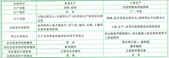 工业生产活动同农业生产活动一样,都是人类最基本、最重要的生产活动,但工业生产与农业生产不同,二者的区别如下表所示: