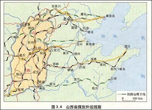 2、提高晋煤外运能力 ①目的:为了缓解交通压力,提高晋煤外运的能力 ②措施:加强交通设施的建设 ③结果:逐步形成了以铁路运输为主、公路运输为辅的煤炭外运路网体系 ④铁路运煤路线:大秦线、神黄线、焦兖日线 铁路运煤干线 1. 大秦线 (1)起止点:大同→秦皇岛 (2)连通海港:秦皇岛 (3)海运:海运至华东、华南地区 2. 神黄线 (1)起止点:陕西省神木→河北黄骅 (2)连通海港:黄骅 (3)海运:海运至华东、华南地区 3. 焦—兖—日线 (1)起止点:焦作→兖州→日照 (2)连通海港:日照 (3)海运:海运至华东、华南地区
