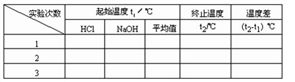 ②用一个量筒量取50ml 0.50 盐酸,倒入小烧杯中,并用温度计测量盐酸的温度,记入下表。然后把温度计上的酸用水冲洗干净。 ③用另一个量筒量取50ml0.55 NaOH溶液,并用温度计测量NaOH溶液的温度,记入下表。 ④把温度计和环形玻璃搅拌棒放入小烧杯的盐酸中,并把量筒中的NaOH溶液一次倒入小烧杯(注意不要洒到外面)。用环形玻璃搅拌棒轻轻搅动溶液,并准确读取混合液的最高温度,记为终止温度t2 。 ⑤重复实验三次,取测量所得数据的平均值作为计算依据。