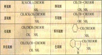 氨基酸(必修2、选修5) 〖组成结构〗 羧酸分子中烃基上的氢原子被氨基取代的化合物。氨基酸中含有两种官能团:氨基、羧基。 天然蛋白质水解的最终产物都是α-氨基酸,即氨基在羧基的α位上,α-氨基酸的结构通式为 , 〖必需氨基酸〗 构成人体蛋白质的常氨基酸大约有20种,部分在人体内可以合成;而缬氨酸、亮氨酸、异亮氨酸、苯丙氨酸、蛋氨酸、丝氨酸、苏氨酸和赖氨酸等8种氨基酸人体自身不能合成,必须通过食物摄入,它们被称为必需氨基酸。见下图