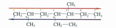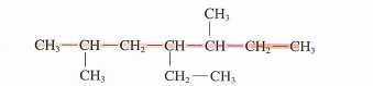②编号位,定支链。以靠近支链最近的一端为起点,将主链中的碳原子用阿拉伯数字编号,以确定支链的位置。 例:在下面的烷烃中,如果从左向右编号(下图红色箭头所示),2位上有一个甲基;如果从右向左编号(下图蓝色箭头所示),3位上才有甲基。两者相比较,从左向右编号可以使甲基位次较低,因此应选择从左向右的顺序给碳链编号。