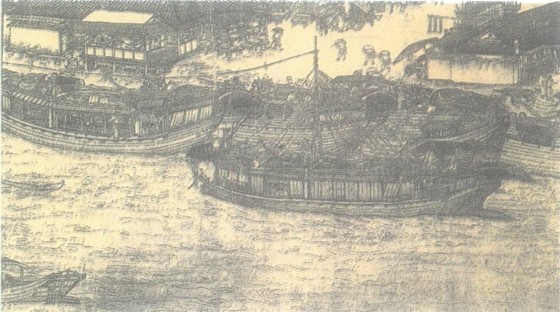 中国十大传世名画之一的清明上河图为北宋风俗画作品,是北宋画家张择端存世仅见的一幅精品,作品以长卷形式,采用散点透视的构图法,描述北宋京城汴梁以及汴河两岸的繁华景象和自然风光,生动地记录了中国十二世纪城市生活的面貌。全图分为三个段落。首段,汴京郊野的春光;中段,繁忙的汴河码头;后段,热闹的市区街道。