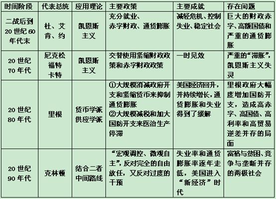 ③经济政策:A.里根政府:用大规模削减政府开支和紧缩货币来抑制通货膨胀;用大规模减税和加大国防开支来医治生产停滞。B.克林顿政府:实施“宏观调控、微观自主”的经济政策,其宗旨是既反对完全的自由放任,又反对过度的政府干预。与美国多年来奉行的赤字政策相反,克林顿政府把平衡预算、消灭赤字、偿还国债作为干预经济的重要目标,通过缩减政府开支、裁减政府雇员、适当增税、鼓励消费等措施,解决了长困扰美国经济的赤字问题。