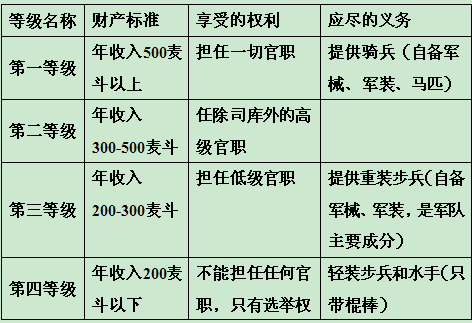 财产等级制,是公元前594年梭伦改革梭伦制定的政策。公民每年的总收入折合成农产品计算财产,按财产的多少划分四个等级,个人权利大小与其所拥有的财产成比例。财产等级制打破了贵族垄断政权的局面,动摇了贵族政治的基础,为雅典民主政治发展开辟了道路;但第四等级的农民、手工业者在没有薪金补贴的情况下不可能经常参与政权。