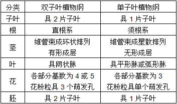 被子植物分为二个纲,即双子叶植物纲和单子叶植物纲,它们的基本区别如下: