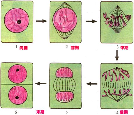 〖记忆口诀〗 有丝分裂分五段,间前中后末相连。间期首先作准备,染体复制在其间;膜仁消失现两体(前);赤道板上排整齐(中);均分牵引到两极(后);两消两现新壁建(末)。 ——感谢热心学友提供