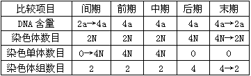 有丝分裂染色体、DNA、染色单体的变化规律 〖数量变化〗 染色体、染色单体、DNA数目的变化可用下表表示(假定正常二倍体细胞的细胞核中DNA含量为2a,染色体数目为2N)。