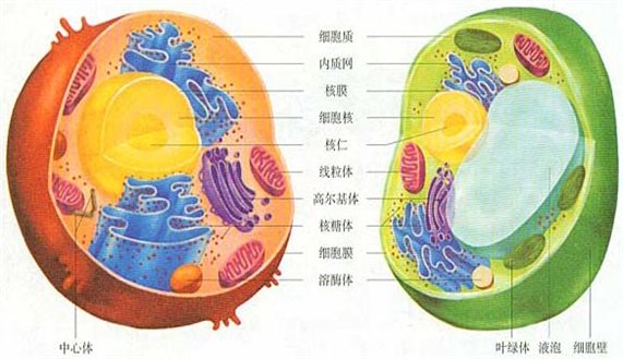 细胞的基本结构 (1)细胞膜的结构和功能 化学成分:蛋白质和磷脂分子 结构:磷脂双分子层做骨架,中间镶嵌、贯穿、覆盖着蛋白质 特点:结构特点是一定的流动性,功能特点是选择透过性。 功能:1、保护细胞内部 2、交换运输物质 3、细胞间识别、免疫(膜上的糖蛋白) (2)细胞壁的成分和功能 植物细胞细胞壁的化学成分:纤维素和果胶。 功能:支持、保护。 (3)生物膜系统的结构和功能 单层膜:液泡、溶酶体、内质网、高尔基体、细胞膜 双层膜:线粒体、叶绿体、核膜 无膜:中心体、核糖体 (4)细胞质 细胞膜以内、细胞核以外的部分,叫细胞质;是均匀透明的胶状物质,包括细胞质基质和细胞器。 功能:含多种物质(水、无机盐、氨基酸、酶等)是活细胞新陈代谢的场所。提供物质和环境条件。 (5)线粒体和叶绿体的基本结构和主要功能 线粒体:真核细胞主要细胞器(动植物都有),机能旺盛的含量多。呈粒状、棒状,具有双膜结构,内膜向内突起形成“嵴”,内膜基质和基粒上有与有氧呼吸有关的酶,是有氧呼吸第二、三阶段的场所,生命体95%的能量来自线粒体,又叫“动力工厂”。含少量的DNA、RNA。 叶绿体:只存在于植物的绿色细胞中。扁平的椭球形或球形,双层膜结构。基粒上有色素,基质和基粒中含有与光合作用有关的酶,是光合作用的场所。含少量的DNA、RNA。 (6)其他细胞器的主要功能 内质网:单层膜折叠体,是有机物的合成“车间”,蛋白质运输的通道。 核糖体:无膜的结构,椭球形粒状小体,将氨基酸缩合成蛋白质。蛋白质的“装配机器”。 高尔基体:单膜囊状结构,动物细胞中与分泌物的形成有关,植物中与有丝分裂中细胞壁的形成有关。 中心体:无膜结构,由垂直的两个中心粒构成,存在于动物和低等植物中,与动物细胞有丝分裂有关。 液泡:单膜囊泡,成熟的植物有大液泡。功能:贮藏(营养、色素等)、保持细胞形态,调节渗透吸水。 溶酶体:单层膜包被的囊状结构,含丰富的水解酶,具有细胞内的消化功能。 (7)细胞核的结构和功能 真核细胞核包括核液、核膜(上有核孔)、核仁、染色质。功能:是遗传物质复制和储存的场所。 (8)原核细胞的基本结构 最主要区别:原核细胞没有由核膜包围的细胞核(有明显核区——拟核)。 原核细胞细胞壁不含纤维素,主要是糖类与蛋白质结合而成。细胞膜与真核相似。 (9)动物细胞(左)与植物细胞(右)亚显微结构模式图