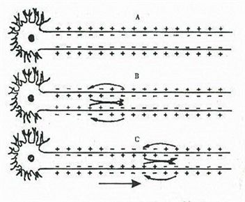兴奋在神经纤维上的传导方向与局部电流方向 (1)兴奋在神经纤维上的传导方向是双向的,是由兴奋部位传向未兴奋部位。 (2)在膜外,兴奋的传导方向与局部电流方向相反;局部电流方向是由未兴奋部位传到兴奋部位。 (3)在膜内,兴奋的传导方向与局部电流方向相同,都是由兴奋部位流向未兴奋部位。 如下图:A:静息时;B:发生兴奋后;C:传导过程中(弯箭头表示膜内外局部电流的流动方向,下方直箭头表示兴奋传导方向)
