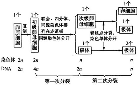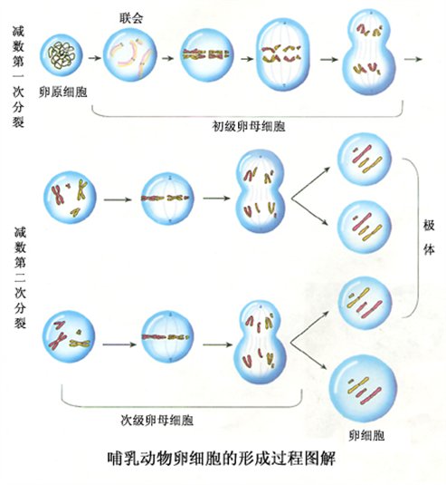 初级卵母细胞经过减数第一次分裂,形成大小不同的两个细胞,大的叫次级卵母细胞,小的叫做极体。次级卵母细胞进行减数第二次分裂,就形成一个大的卵细胞和一个小的极体。减数第一次分裂过程中形成的极体也分裂为两个极体。