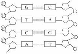 DNA分子结构特点 〖特点〗 1、DNA分子是由两条链组成,这两条链按反向平行方式盘旋成双螺旋结构。 2、DNA分子的长链是以4种脱氧核苷酸为单位连接而成的,这4种脱氧核苷酸分别含有A(腺嘌呤)、T(胸腺嘧啶)、C(胞嘧啶)、G(鸟嘌呤)四种碱基。 3、DNA分子中的脱氧核糖和磷酸交替连接,排列在外侧,构成基本骨架;碱基排列在内侧。 4、DNA两条链上的碱基通过氢键按碱基互补配对原则连接成碱基对。数量上,A=T,G=C。 〖关键点〗 1、组成DNA分子的两条链的脱氧核苷酸数目相等。 2、两条链之间的碱基、脱氧核糖和磷酸的数目对应相等。 3、腺嘌呤(A)和胸腺嘧啶(T)之间只有2个氢键,而鸟嘌呤(G)和胞嘧啶(C)之间拥有3个氢键。因此在一些结构示意图中,通常表示为:A=T、G≡C。 4、根据碱基对之间的氢键个数,可以推测DNA分子的热稳定性。DNA分子中G≡C碱基对越多,分子越稳定。