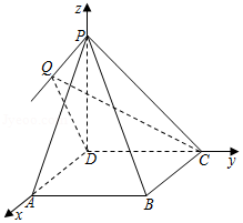 则$D(0$,0,$0)$,$A(1$,0,$0)$,$C(0$,1,$0)$,$P(0$,0,$1)$,$B(1$,1,$0)$,作$PQ//AD$,则$PQ$为平面$PAD$与平面$PBC$的交线为$l$,因为$QB=\sqrt{2}$,$\Delta QAB$是等腰直角三角形,所以$Q(1$,0,$1)$, 则$\overrightarrow{DQ}=(1$,0,$1)$,$\overrightarrow{PB}=(1$,1,$-1)$,$\overrightarrow{DC}=(0$,1,$0)$, 设平面$QCD$的法向量为$\overrightarrow{n}=(a$,$b$,$c)$, 则$\left\{\begin{array}{l}{\overrightarrow{n}\cdot \overrightarrow{DC}=0}\\ {\overrightarrow{n}\cdot \overrightarrow{DQ}=0}\end{array}\right.$,$\therefore$$\left\{\begin{array}{l}{b=0}\\ {a+c=0}\end{array}\right.$,取$c=1$,可得$\overrightarrow{n}=(-1$,0,$1)$, $\therefore \cos <\overrightarrow{n}$,$\overrightarrow{PB}>=\dfrac{\overrightarrow{n}\cdot \overrightarrow{PB}}{\vert \overrightarrow{n}\vert \vert \overrightarrow{PB}\vert }=\dfrac{-1-1}{\sqrt{3}\cdot \sqrt{2}}=\dfrac{\sqrt{6}}{3}$, $\therefore PB$与平面$QCD$所成角的正弦值为$\dfrac{\sqrt{6}}{3}$. 点评:本题考查空间线面垂直的判定,以及线面角的求法,考查转化思想和向量法的运用,考查运算能力和推理能力,属于中档题.