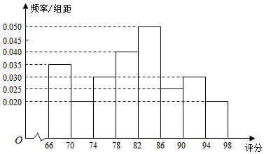 2021年高考数学天津4从某网络平台推荐的影视作品中抽取400部,统计其评分数据,将所得400个评分数据分为8组:$[66$,$70)$,$[70$,$74)$,$\ldots$,$[94$,$98)$,并整理得到如下的频率分布直方图,则评分在区间$[82$,$86)$内的影视作品数量是(  )