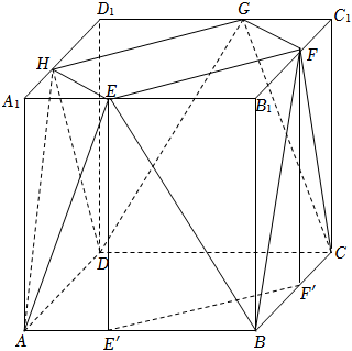(2)解:易知包装盒的容积为长方体的体积减去四个三棱锥的体积, 其中长方体的高$AA_{1}=EE'=4\sqrt{3}$, 长方体的体积$V_{1}=8\times 8\times 4\sqrt{3}=256\sqrt{3}cm^{3}$, 一个三棱锥的体积$V_{2}=\dfrac{1}{3}\times (\dfrac{1}{2}\times 4\times 4)\times 4\sqrt{3}=\dfrac{32\sqrt{3}}{3}cm^{3}$, 则包装盒的容积为$V=V_{1}-4V_{2}=256\sqrt{3}-4\times \dfrac{32\sqrt{3}}{3}=\dfrac{640}{3}\sqrt{3}cm^{3}$. 点评:本题主要考查线面平行的判定,空间几何体体积的计算等知识,属于中等题.