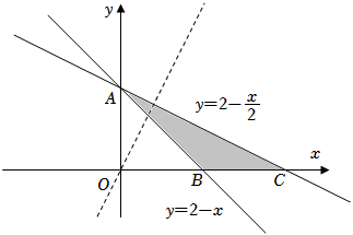 (5分)若$x$,$y$满足约束条件$\left\{{\left.\begin{array}{l}{x+y\geqslant 2,}\\ {x+2y\leqslant 4,}\\ {y\geqslant 0,}\end{array}\right.}\right.$则$z=2x-y$的最大值是( ) A.$-2$ B.4 C.8 D.12 分析:作出可行域,根据图象即可得解. 解:作出可行域如图阴影部分所示,