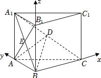 分析:(1)利用体积法可求点$A$到平面$A_{1}BC$的距离; (2)以$B$为坐标原点,$BC$,$BA$,$BB_{1}$所在直线为坐标轴建立如图所示的空间直角坐标系,利用向量法可求二面角$A-BD-C$的正弦值. 解:(1)由直三棱柱$ABC-A_{1}B_{1}C_{1}$的体积为4,可得$V{}_{{A}_{1}-ABC}=\dfrac{1}{3}V{}_{{A}_{1}{B}_{1}{C}_{1}-ABC}=\dfrac{4}{3}$, 设$A$到平面$A_{1}BC$的距离为$d$,由$V{}_{{A}_{1}-ABC}=V{}_{A-{A}_{1}BC}$, $\therefore$$\dfrac{1}{3}S{}_{\triangle {A}_{1}BC}\cdot d=\dfrac{4}{3}$,$\therefore$$\dfrac{1}{3}\times 2\sqrt{2}\cdot d=\dfrac{4}{3}$,解得$d=\sqrt{2}$. (2)连接$AB_{1}$交$A_{1}B$于点$E$,$\because AA_{1}=AB$,$\therefore$四边形$ABB_{1}A_{1}$为正方形, $\therefore AB_{1}\bot A_{1}B$,又$\because$平面$A_{1}BC\bot$平面$ABB_{1}A_{1}$,平面$A_{1}BC\bigcap$平面$ABB_{1}A_{1}=A_{1}B$, $\therefore AB_{1}\bot$平面$A_{1}BC$,$\therefore AB_{1}\bot BC$, 由直三棱柱$ABC-A_{1}B_{1}C_{1}$知$BB_{1}\bot$平面$ABC$,$\therefore BB_{1}\bot BC$,又$AB_{1}\bigcap BB_{1}=B_{1}$, $\therefore BC\bot$平面$ABB_{1}A_{1}$,$\therefore BC\bot AB$, 以$B$为坐标原点,$BC$,$BA$,$BB_{1}$所在直线为坐标轴建立如图所示的空间直角坐标系,