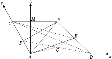 分析:(1)连接$OA$,$OB$,可证得$OA=OB$,延长$BO$交$AC$于点$F$,可证得$OE//PF$,由此得证; (2)建立空间直角坐标系,写出各点的坐标,再求出平面$ACE$及平面$ABE$的法向量,利用向量的夹角公式得解. 解:(1)证明:连接$OA$,$OB$,依题意,$OP\bot$平面$ABC$, 又$OA\subset$平面$ABC$,$OB\subset$平面$ABC$,则$OP\bot OA$,$OP\bot OB$, $\therefore \angle POA=\angle POB=90^\circ$, 又$PA=PB$,$OP=OP$,则$\Delta POA\cong \Delta POB$, $\therefore OA=OB$, 延长$BO$交$AC$于点$F$,又$AB\bot AC$,则在$\rm{Rt}\Delta ABF$中,$O$为$BF$中点,连接$PF$, 在$\Delta PBF$中,$O$,$E$分别为$BF$,$BP$的中点,则$OE//PF$, $\because OE\not\subset$平面$PAC$,$PF\subset$平面$PAC$, $\therefore OE//$平面$PAC$; (2)过点$A$作$AM//OP$,以$AB$,$AC$,$AM$分别为$x$轴,$y$轴,$z$轴建立如图所示的空间直角坐标系,
