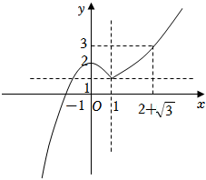 (6分)已知函数$f(x)=\left\{\begin{array}{l}{-{x^2}+2,x\leqslant 1,}\\ {x+\dfrac{1}{x}-1,x > 1,}\end{array}\right.$则$f(f(\dfrac{1}{2}))=$ $\dfrac{37}{28}$ ;若当$x\in [a$,$b]$时,$1\leqslant f(x)\leqslant 3$,则$b-a$的最大值是 . 分析:直接由分段函数解析式求$f(f(\dfrac{1}{2}))$;画出函数$f(x)$的图象,数形结合得答案. 解:$\because$函数$f(x)=\left\{\begin{array}{l}{-{x}^{2}+2,x\leqslant 1}\\ {x+\dfrac{1}{x}-1,x > 1}\end{array}\right.$,$\therefore f(\dfrac{1}{2})=-\dfrac{1}{4}+2=\dfrac{7}{4}$, $\therefore f(f(\dfrac{1}{2}))=f(\dfrac{7}{4})=\dfrac{7}{4}+\dfrac{4}{7}-1=\dfrac{37}{28}$; 作出函数$f(x)$的图象如图:
