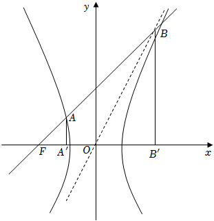 (4分)已知双曲线$\dfrac{x^2}{a^2}-\dfrac{y^2}{b^2}=1(a > 0,b > 0)$的左焦点为$F$,过$F$且斜率为$\dfrac{b}{4a}$的直线交双曲线于点$A(x_{1}$,$y_{1})$,交双曲线的渐近线于点$B(x_{2}$,$y_{2})$且$x_{1} < 0 < x_{2}$.若$\vert FB\vert =3\vert FA\vert$,则双曲线的离心率是 $\dfrac{3\sqrt{6}}{4}$ . 分析:过点$A$作$AA\prime \bot x$轴于点$A\prime$,过点$B$作$BB\prime \bot x$轴于点$B\prime$,依题意,点$B$在渐近线$y=\dfrac{b}{a}x$上,不妨设$B(m,\dfrac{b}{a}m),m > 0$,根据题设条件可求得点$A$的坐标为$(-\dfrac{5c}{9},\dfrac{bc}{9a})$,代入双曲线方程,化简可得$a$,$c$的关系,进而得到离心率. 解:如图,过点$A$作$AA\prime \bot x$轴于点$A\prime$,过点$B$作$BB\prime \bot x$轴于点$B\prime$,