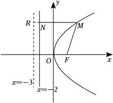 (4分)已知抛物线$C:y^{2}=8x$的焦点为$F$,点$M$在$C$上,若$M$到直线$x=-3$的距离为5,则$\vert MF\vert =($ $)$ A.7 B.6 C.5 D.4 答案:$D$ 分析:本题只需将点$M$到$x=-3$的距离,转化为到准线$x=-2$的距离,再根据抛物线定义即可求得. 解:如图所示,因为点$M$到直线$x=-3$的距离$\vert MR\vert =5$,