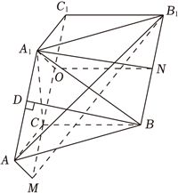 $\therefore$四边形$BCON$为平行四边形, $\therefore ON\bot$平面$A_{1}C_{1}CA$, $A_{1}O\bigcap ON=O$,$\therefore CC_{1}\bot$平面$A_{1}ON$, $\because A_{1}N\subset$平面$A_{1}ON$, $\therefore CC_{1}\bot A_{1}N$, $\therefore AA_{1}\bot A_{1}N$, $\therefore A_{1}N$为直线$AA_{1}$与$BB_{1}$距离, $\therefore A_{1}N=2$,$\therefore ON=\sqrt{3}$, 由(1)可知$AM\bot$平面$BCC_{1}B_{1}$, $\therefore \angle AB_{1}M$为$AB_{1}$与平面$BCC_{1}B_{1}$所成角的角, 易求得$C_{1}M=3$, $\therefore B_{1}M=\sqrt{9+3}=2\sqrt{3}$, $\because A_{1}M=1$,$\therefore AB_{1}=\sqrt{1+12}=\sqrt{13}$, $\therefore \sin \angle AB_{1}M=\dfrac{1}{\sqrt{13}}=\dfrac{\sqrt{13}}{13}$. $\therefore AB_{1}$与平面$BCC_{1}B_{1}$所成角的正弦值为$\dfrac{\sqrt{13}}{13}$. 点评:本题考查线线相等的证明,考查线面角的求法,属中档题.