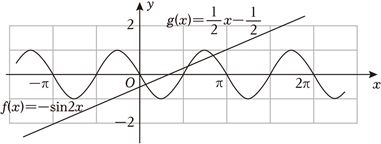 (5分)函数$y=f(x)$的图象由$y=\cos (2x+\dfrac{\pi }{6})$的图象向左平移$\dfrac{\pi }{6}$个单位长度得到,则$y=f(x)$的图象与直线$y=\dfrac{1}{2}x-\dfrac{1}{2}$的交点个数为$($ $)$ A.1 B.2 C.3 D.4 答案:$C$ 分析:利用三角函数的图象变换,求解函数的解析式,然后判断两个函数的图象交点个数即可. 解:$y=\cos (2x+\dfrac{\pi }{6})$的图象向左平移$\dfrac{\pi }{6}$个单位长度得到$f(x)=\cos (2x+\dfrac{\pi }{2})=-\sin 2x$, 在同一个坐标系中画出两个函数的图象,如图: