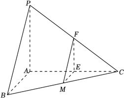 (14分)已知三棱锥$P-ABC$中,$PA\bot$平面$ABC$,$AB\bot AC$,$PA=AB=3$,$AC=4$,$M$为$BC$中点,过点$M$分别作平行于平面$PAB$的直线交$AC$、$PC$于点$E$,$F$. (1)求直线$PM$与平面$ABC$所成角的大小; (2)求直线$ME$到平面$PAB$的距离.