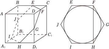 (5分)下列物体中,能够被整体放入棱长为1(单位:$m)$的正方体容器(容器壁厚度忽略不计)内的有$($ $)$ A.直径为$0.99m$的球体 B.所有棱长均为$1.4m$的四面体 C.底面直径为$0.01m$,高为$1.8m$的圆柱体 D.底面直径为$1.2m$,高为$0.01m$的圆柱体 答案:$ABD$ 分析:对于$A$,由正方体的内切球直径大于0.99可判断;对于$B$,由正方体内部最大的正四面体的棱长大于1.4可判断;对于$C$,由正方体的体对角线小于1.8可判断;对于$D$,取$E$,$F$,$G$,$H$,$I$,$J$都为棱中点,则六边形$EFGHIJ$为正六边形,由正六边形的内切圆直径大于1.2可判断. 解:对于$A$,棱长为1的正方体内切球的直径为$1 > 0.99$,选项$A$正确; 对于$B$,如图,