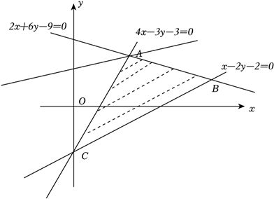 (5分)若实数$x$,$y$满足约束条件$\left\{\begin{array}{l}{4x-3y-3\geqslant 0,}\\ {x-2y-2\leqslant 0,}\\ {2x+6y-9\leqslant 0,}\end{array}\right.$则$z=x-5y$的最小值为( ) A.5 B.$\dfrac{1}{2}$ C.$-2$ D.$-\dfrac{7}{2}$ 答案:D 分析:先求出平面区域的边界点,结合$z$的几何意义检验取得最小值时点的坐标,代入即可求解. 解:作出不等式组$\left\{\begin{array}{l}{4x-3y-3\geqslant 0,}\\ {x-2y-2\leqslant 0,}\\ {2x+6y-9\leqslant 0,}\end{array}\right.$所表示的平面区域,如图所示: 将约束条件两两联立可得3个交点:$C(0,-1)$,$A(\dfrac{3}{2},1)$,$B(3,\dfrac{1}{2})$, 由$z=x-5y$得$y=\dfrac{1}{5}x-\dfrac{1}{5}z$,则$-\dfrac{1}{5}z$可看作直线$y=\dfrac{1}{5}x-\dfrac{1}{5}z$在$y$轴上的截距, 经检验可知,当直线经过点$A(\dfrac{3}{2}$,$1)$时,$z$最小,代入目标函数可得:$z_{min}=-\dfrac{7}{2}$.