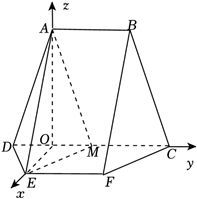 分析:(1)易证四边形$EFCM$为平行四边形,由线面平行的判定定理即可证明; (2)取$DM$的中点$O$,连结$OA$,$OE$,则$OA\bot DM$,$OE\bot DM$,$OA\bot OE$,建立空间直角坐标系,利用空间向量法求二面角即可. (1)证明:由题意得:$EF//CM$,$EF=CM$, 所以四边形$EFCM$为平行四边形, 所以$EM//CF$, 而$EM\not\subset$平面$BCF$,$CF\subset$平面$BCF$, 所以$EM//$平面$BCF$. (2)解:取$DM$的中点$O$,连结$OA$,$OE$, 由已知得,$\Delta EMD$是边长为2的等边三角形,$\Delta ADM$是以$AD=AM=\sqrt{10}$为腰的等腰三角形, 则$OE\bot DM$,$OA\bot DM$,$OA=3$,$OE=\sqrt{3}$, 故$OA\bot OE$,以$O$为坐标原点,建立如图所示的空间直角坐标系,