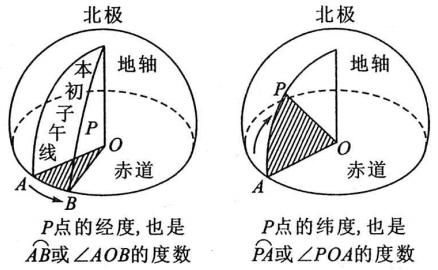 ②某点的经度是:经过这点的经线与地轴确定的半平面与本初子午线(0°经线)和地轴确定的半平面所成的二面角度数.此角实则为二面角. 某点的纬度是:经过这点的球半径与赤道面所成角的度数.此角实则为线面角.下面用图评注.