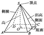 ③棱锥的相关概念: 这个多边形叫做棱锥的底面或底; 有公共顶点的各个三角形面叫做棱锥的侧面; 各侧面的公共顶点叫做棱锥的顶点; 相邻侧面的公共边叫做棱锥的侧棱。 顶点到底面的距离叫做棱锥的高(如下图)。