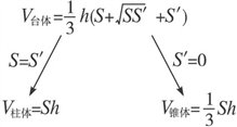 时,台体的体积公式变为柱体的体积公式,因此,柱体、锥体的体积公式可以看作台体体积公式的“特殊”形式。它们之间的体积关系为: