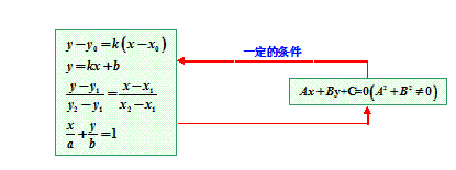 Ⅰ、直线的特殊形式方程经过运算、整理,都可以化为直线一般形式的方程。 Ⅱ、直线一般形式的方程在一定条件下可以化为特殊形式的方程。这里“一定条件”是不可缺少的。如当B≠0时,方程可化为 ,这就是直线的斜截式方程。 Ⅲ、直线特殊形式间的互化可以直接进行,也可以一般式为桥梁,但也要一定的条件。比如截距式可以转化为斜截式,而斜截式不一定可以转化为截距式。 Ⅳ、各种形式之间的互化的实质是方程的同解变形。
