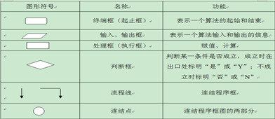 来表示算法的图形,下表给出了程序框、流程线和它们表示的功能。