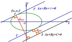 方法2:如图,平行于直线 的动直线 : 与椭圆 相切时,平行线 与 之间的最短或最远距离就是直线与椭圆最短或最远的距离。