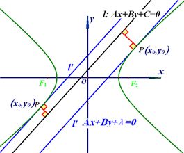方法2:如图,平行于直线 的动直线 : 与双曲线 相切时,平行线 与 之间的较短距离就是直线与双曲线最短的距离。