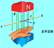 3.右手定则:伸开右手,使拇指与其余四指垂直,并且都与手掌在同一平面内;让磁感线从掌心进入,拇指指向导体运动的方向,四指所指的方向就是感应电流的方向.右手定则被用来判断做切割磁感线运动产生感应电流方向,如下图所示。
