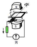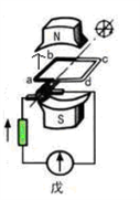 如图所示,当线圈平面逆时针转动位于(乙、丁图)时,即线圈平面与磁感线平行时,ab、cd边的线速度方向都跟磁感线垂直,即两边都垂直切割磁感线,这时感应电动势最大,线圈中的感应电流也最大。
